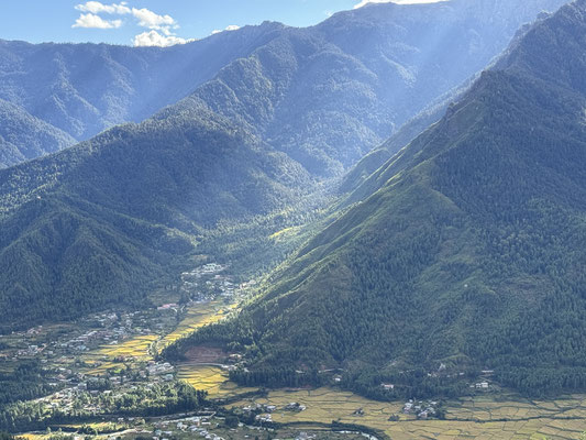 Nach dem Frühstück fahren Sie durch abwechslungsreiche Landschaft durch Wälder, kleine Dörfer, dem Fluss entlang nach Thimphu. . Unterwegs haben Sie Gelegenheit für kurze Spaziergänge, um sich die Beine zu vertreten. Am späteren Nachmittag erreichen Sie die Hauptstadt Thimphu.