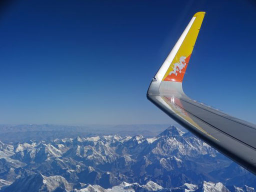 Der Flug von Kathmandu entlang dem Himalaya ist ein eindrückliches Erlebnis, keine andere Linienfluggesellschaft als die Drukair fliegt diese Route so nahe an den höchsten Bergen der Welt vorbei.